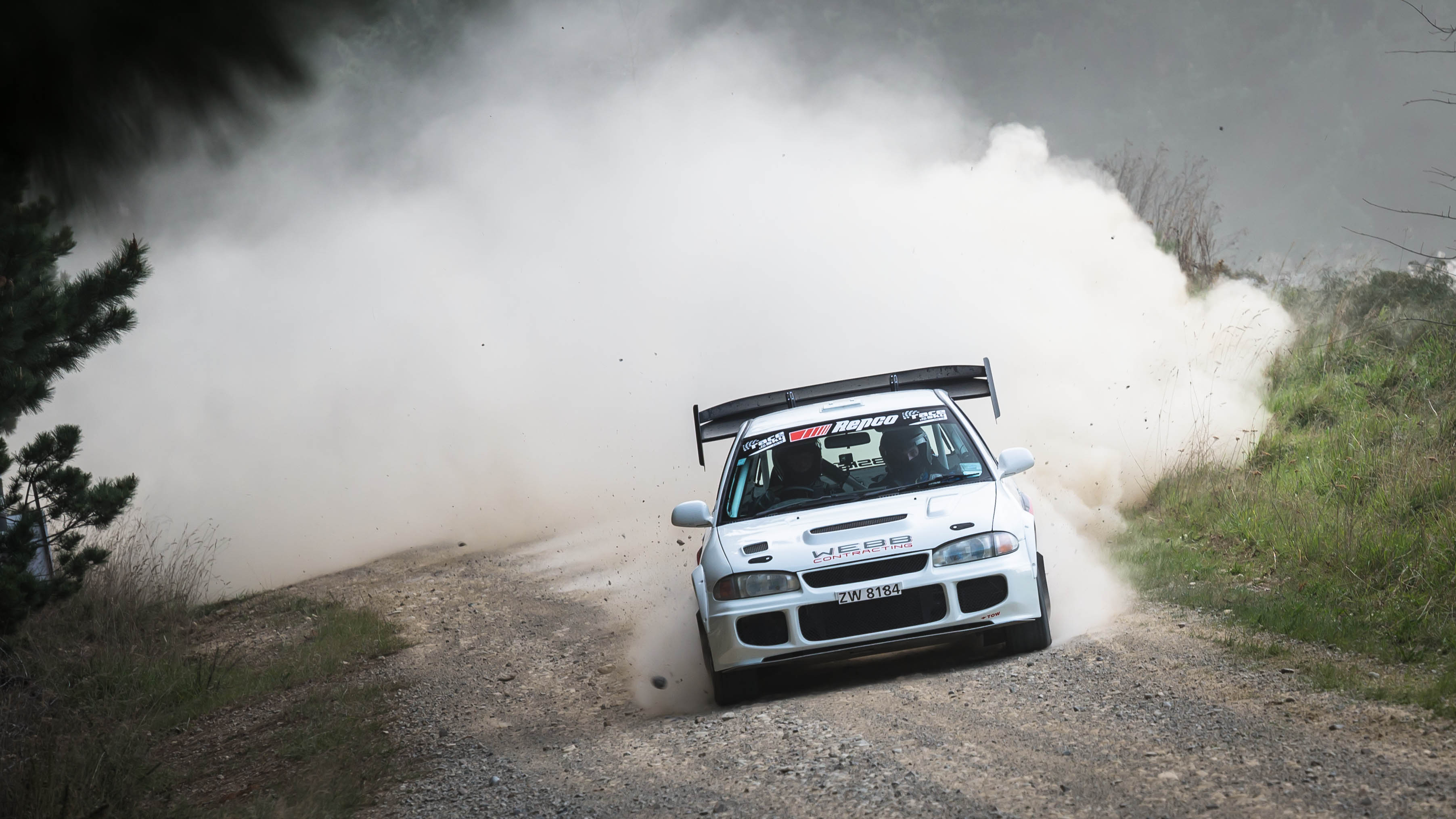 Crossing the finish line during Saturday qualifying sessions at the 2024 Ashley Forest Rallysprint.